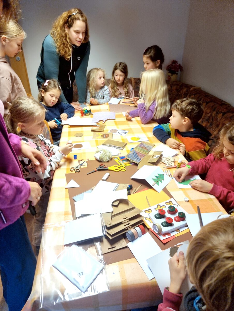 Im Anschluss an das Bilderbuchkino wurden die Kinder selbst kreativ. Bei einer Bastelaktion gestalteten sie Weihnachtskarten, die sie stolz mit nach Hause nehmen durften.