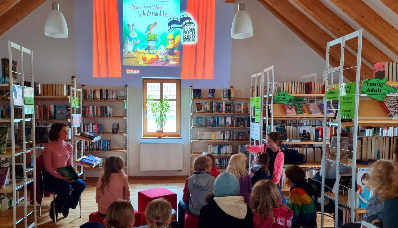 Am Samstag, 20. Dezember, verwandelte sich das Obergeschoss der Bücherei um 10 Uhr in einen gemütlichen Kinosaal für junge Bilderbuchfans. Zahlreiche Kinder ab vier Jahren folgten der Einladung des Büchereiteams und erlebten ein stimmungsvolles Bilderbuchkino zur Weihnachtszeit.