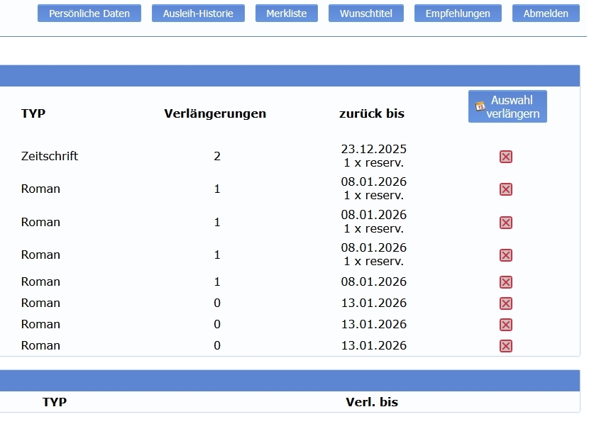 Über die Suchleiste oben rechts gelangen Sie direkt zu Ihrem persönlichen Bereich. Dort finden Sie eine Übersicht über Ihre bisherigen Ausleihen, Ihre Merkliste sowie die Möglichkeit, Wunschtitel an uns zu übermitteln. Ganz neu integriert sind zudem persönliche Empfehlungen, die Ihnen weitere Inspiration für Ihren nächsten Bibliotheksbesuch bieten.
