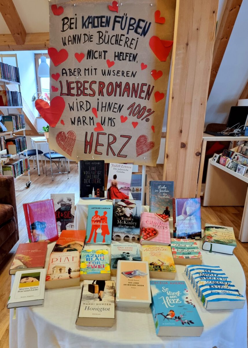 Im Obergeschoss der Bücherei lädt eine Buchausstellung unter dem Motto „Bei kalten Füßen kann die Bücherei nicht helfen. Aber mit unseren Liebesromanen wird Ihnen zu 100 % warm ums Herz“ zum Stöbern ein.