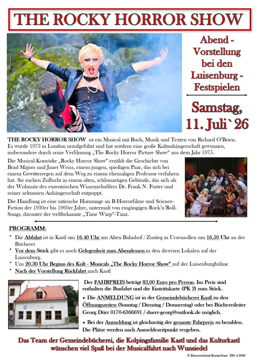 * Die ANMELDUNG ist in der Gemeindebücherei Kastl zu den Öffnungszeiten (Sonntag, von 10.00 – 11.30 Uhr / Dienstag und Donnerstag von 17.00 – 18.30 Uhr) möglich. Bei der ANMELDUNG ist gleichzeitig der gesamte Fahrpreis zu bezahlen. Die Plätze werden nach Anmeldezeitpunkt vergeben.