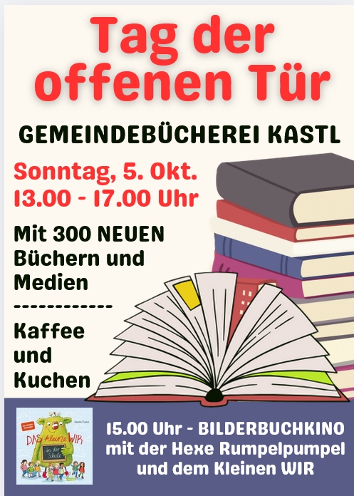 „Tag der offenen Tür“ am Sonntag, 5. Oktober, von 13:00–17:00 Uhr in der Kastler Bücherei – mit einem Bilderbuchkino und der Hexe „Rumpumpel“