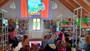 Großes Bilderbuchkino im OG der Bücherei: „Wie feiern Wiesel Weihnachten?“ Am Samstag, 20. Dezember, verwandelte sich das Obergeschoss der Bücherei um 10 Uhr in einen gemütlichen Kinosaal für junge Bilderbuchfans. Zahlreiche Kinder ab vier Jahren folgten der Einladung des Büchereiteams und erlebten ein stimmungsvolles Bilderbuchkino zur Weihnachtszeit. Im Mittelpunkt stand das winterliche Abenteuer „Wie feiern …